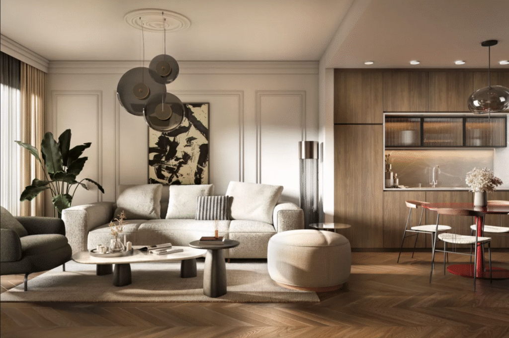 Stan B405 je trosoban, izuzetno funkcionalno organizovan, sa ukupno 127,35 m² neto površine i terasa od 23,40 m². Pored prostranog dnevnog boravka, ima tri kupatila, od kojih je jedno master en-suite, kao i odvojen toalet za goste. Stan je savršen za porodičan život, ali i kao investicija za luksuzni zakup u Beogradu sa stabilnim pasivnim prihodom.
