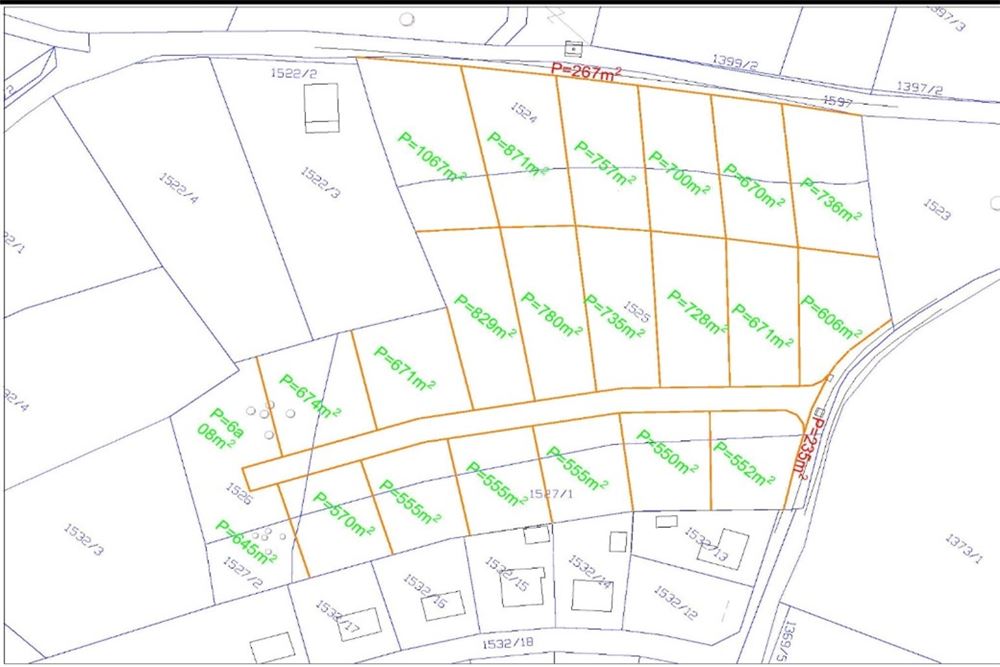 - 551 m², 606 m², 615 m², 671 m² (2 placeva), 674 m², 728 m², 736 m², 779 m², 829 m², 1222 m².